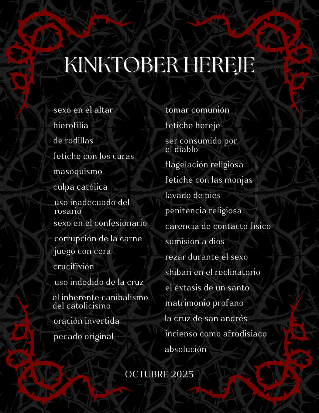 1. There is no need to participate daily. Pick and chose or mix prompts as you please. The event is supposed to be fun, not an obligation!2. IRL pictures or videos are not permitted and will not be shared on the account.3. Tag your work. If posting to AO3, chose whatever Archive Warning it might fit. It is also encouraged to tag any CW/TW you think if may be fit as common courtesy.4. It is encouraged to post your work in AO3. There will be an unmoderated collection to include your work.5. You can participate in any language you want and we encourage you to do so. As this event is planned by part of the hispanic fandom server, versions of the prompts, guidelines and faq in spanish already exist. (If you want to provide translation into any other language, get in contact through any social media!).6. Paywalled content will not be shared. This event is free.7. Any fandom, character, ship is permitted. If AO3 (or the platform you're participating in) allows it, we will not police any content. We only encourage to tag fandoms and ships so people have an easier time looking for stuff they might like!8. Tag our accounts so we can share your work. You can also tag it #HeresyKinktober2025.9. Do not use generative AI.
