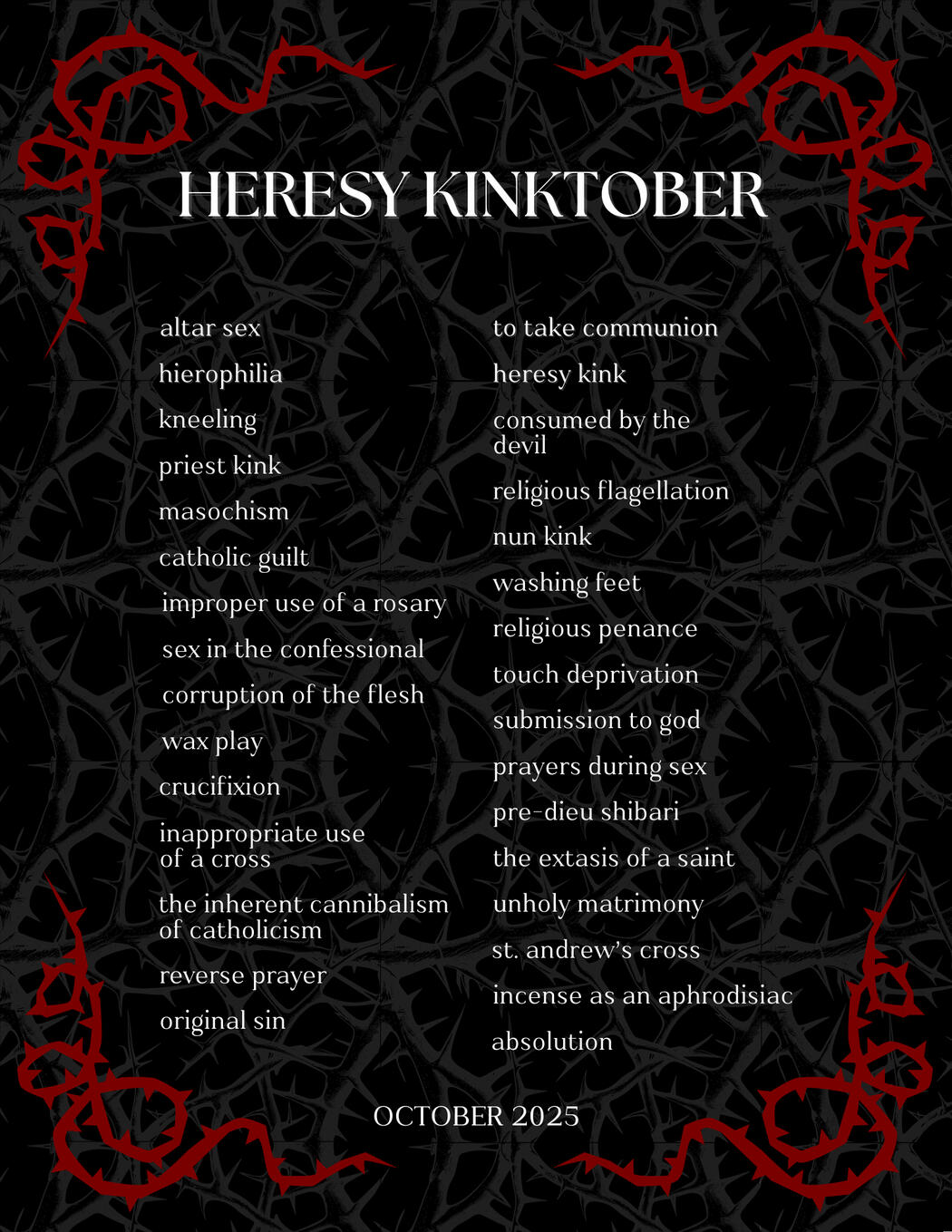 1. Can I mix and match the prompts? Can I just participate with the prompts I like? Yes to both! We want the creators to have the most fun possible and not be stressed! Write only what you can and what you're comfortable with.2. Will there be an AO3 Collection? Yes! Here is the link: Heresy Kinktober 2025. It will stay open and unmoderated, you can add your fics/art/whatever you create during kinktober. The content will not be policed as long as it's allowed on AO3 and are not IRL pictures or videos. The collection will stay open until next kinktober, so you can keep contributing late entries if you like!3. Will you share wips posted on social media? Please share your wips if you want! If you tag our socials, we will share if we're able.4. What does the extasis of a saint means? It's actually ecstasy of a saint! We just we're fooled by our hispanic brains.If you have any other question please reach out through our social medial and we will respond and edit the faq!tbc.